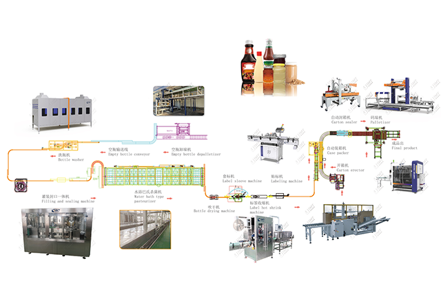 空瓶卸垛——洗瓶——自動(dòng)濃醬灌裝機(jī)——玻璃瓶封口機(jī)——?dú)⒕鷻C(jī)——套標(biāo)機(jī)——貼標(biāo)機(jī)——開箱機(jī)——裝箱機(jī)——封箱機(jī)——碼垛機(jī)