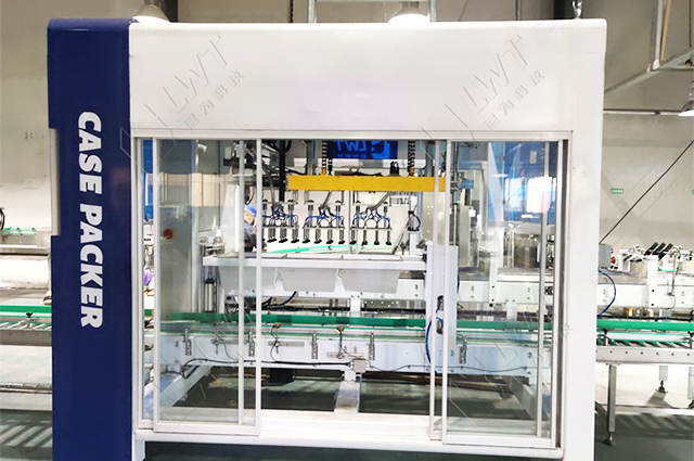 全自動裝箱機處于包裝流水線的后道,通過吸盤將整列好的瓶子由線體裝入到紙箱當中,從而起到操作工便于裝箱目的。