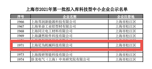 近日,根據(jù)《科技型中小企業(yè)評價辦法》,上海尼為機械科技有限公司被認定為上海市2021年第1批擬入庫科技型中小企業(yè)。這是我司在科技創(chuàng)新型企業(yè)發(fā)展道路上取得的喜人成果,是有關部門給予我司研發(fā)和創(chuàng)新能力的認可。