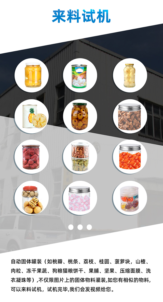自動(dòng)固型物裝罐機(jī)適用于玻璃罐、馬口鐵罐、塑料罐、廣口瓶等容器。主要應(yīng)用于黃桃瓣、桃丁、梨球、山楂、草莓、葡萄、杏、荔枝、紅燒肉、雞肉等罐頭產(chǎn)品的自動(dòng)計(jì)量裝罐。