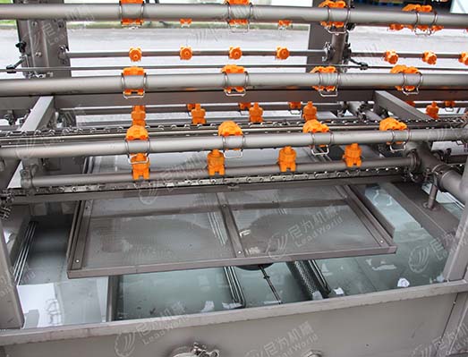 尼為洗筐機(jī)主要采用熱水洗、高壓洗、漂洗的方式進(jìn)行清洗,分為進(jìn)筐、預(yù)洗、主清洗、漂洗、吹干和出筐等環(huán)節(jié)。